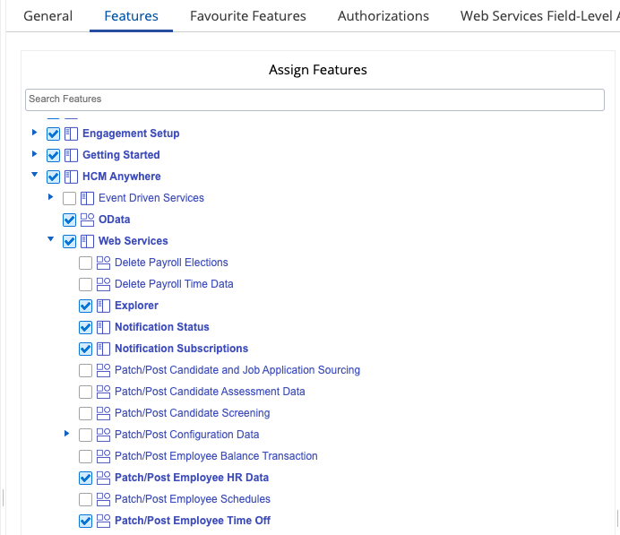 Navigate to Features. Ensure HCM Anywhere and Web Services are checked