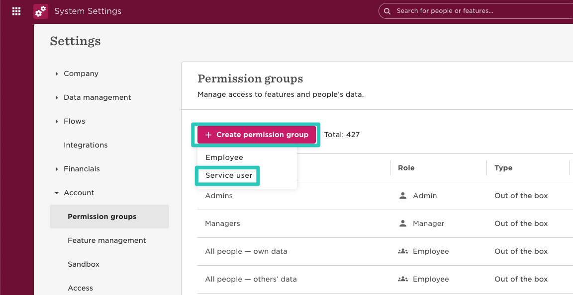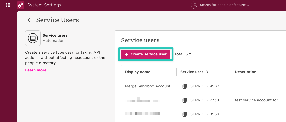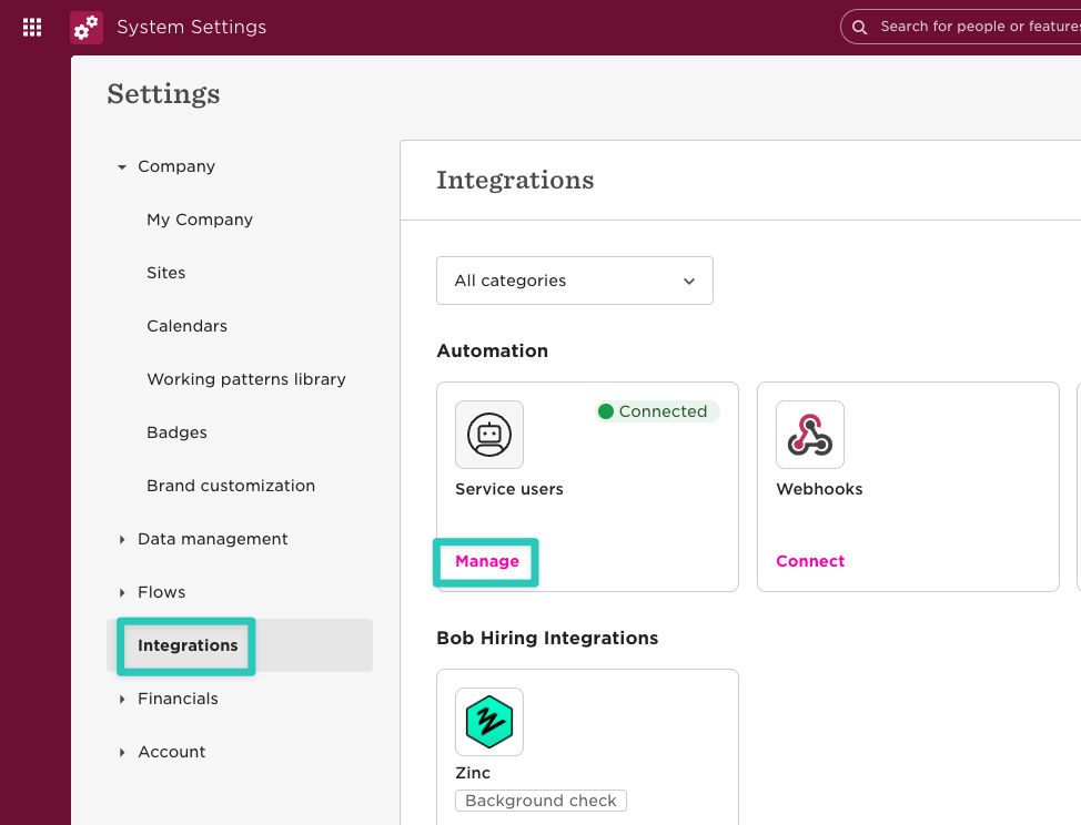 On the Settings screen, open Integrations and click Manage on the Service users tile.