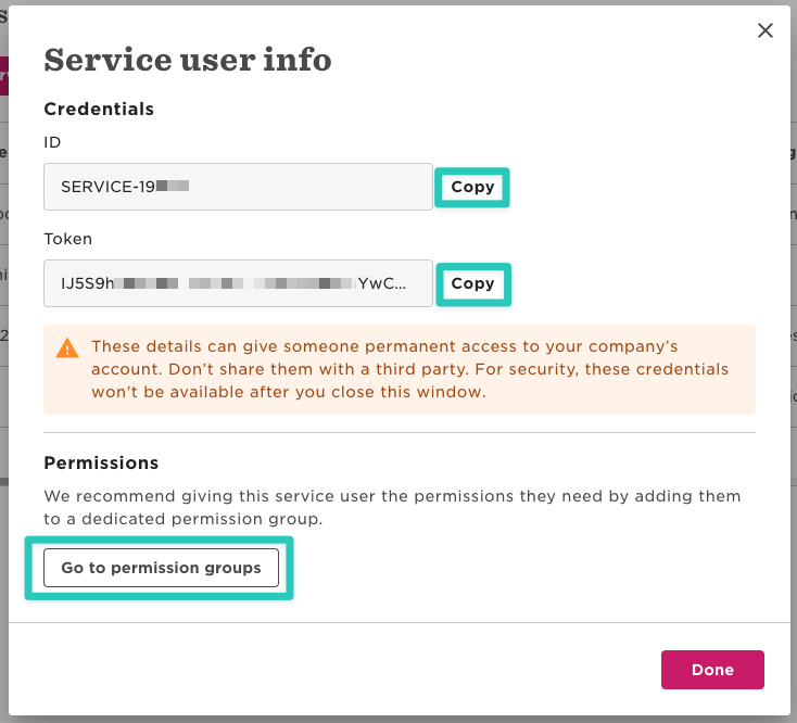 On the next screen, HiBob display the credentials for your new service user. Make a note of both the ID and the Token, then click on Go to permission groups.