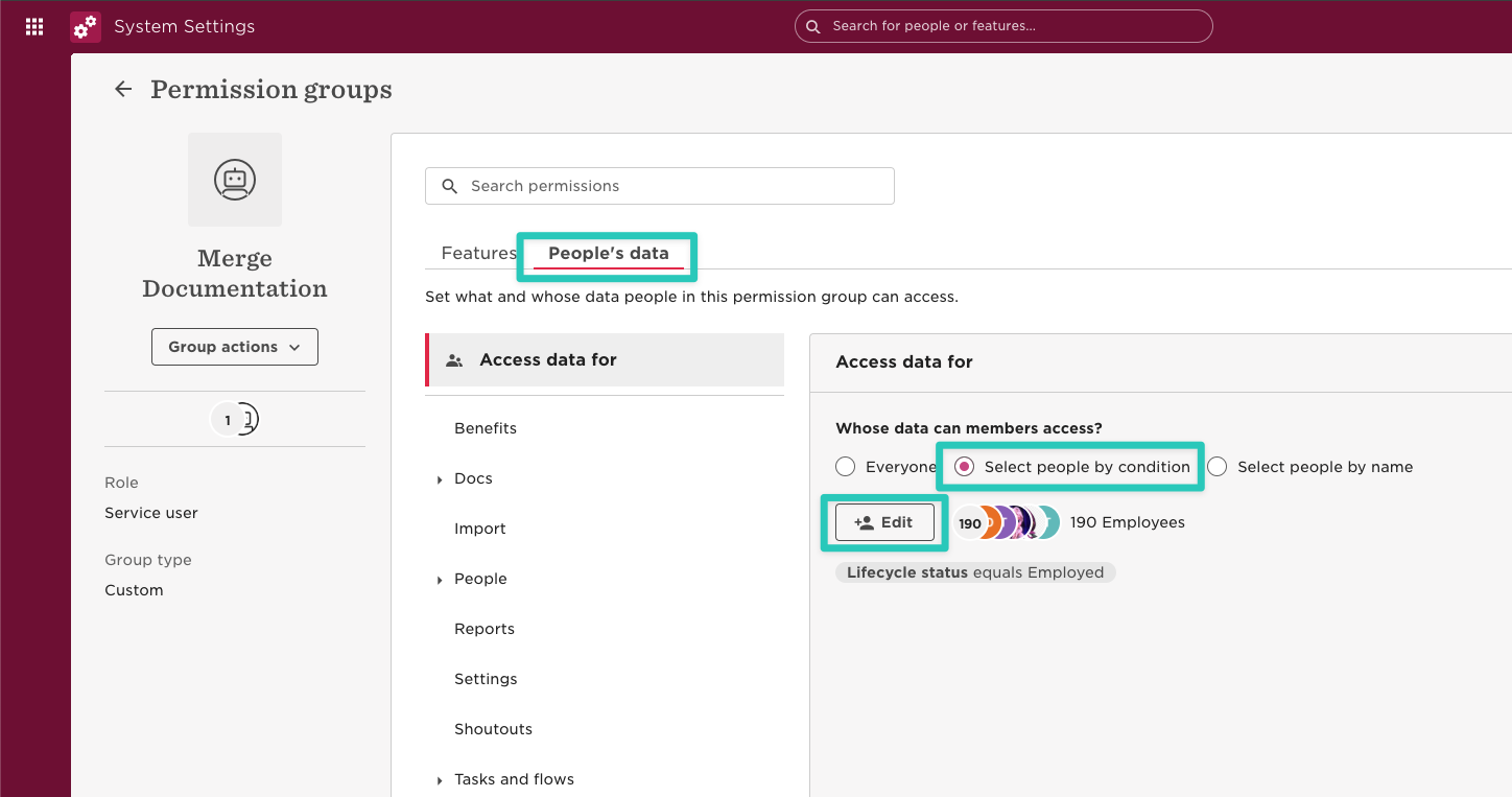Switch to the People's data tab of the new Permission Group, pick Select people by condition under Whose data can members access?, then click Edit to select the people the integration can access.