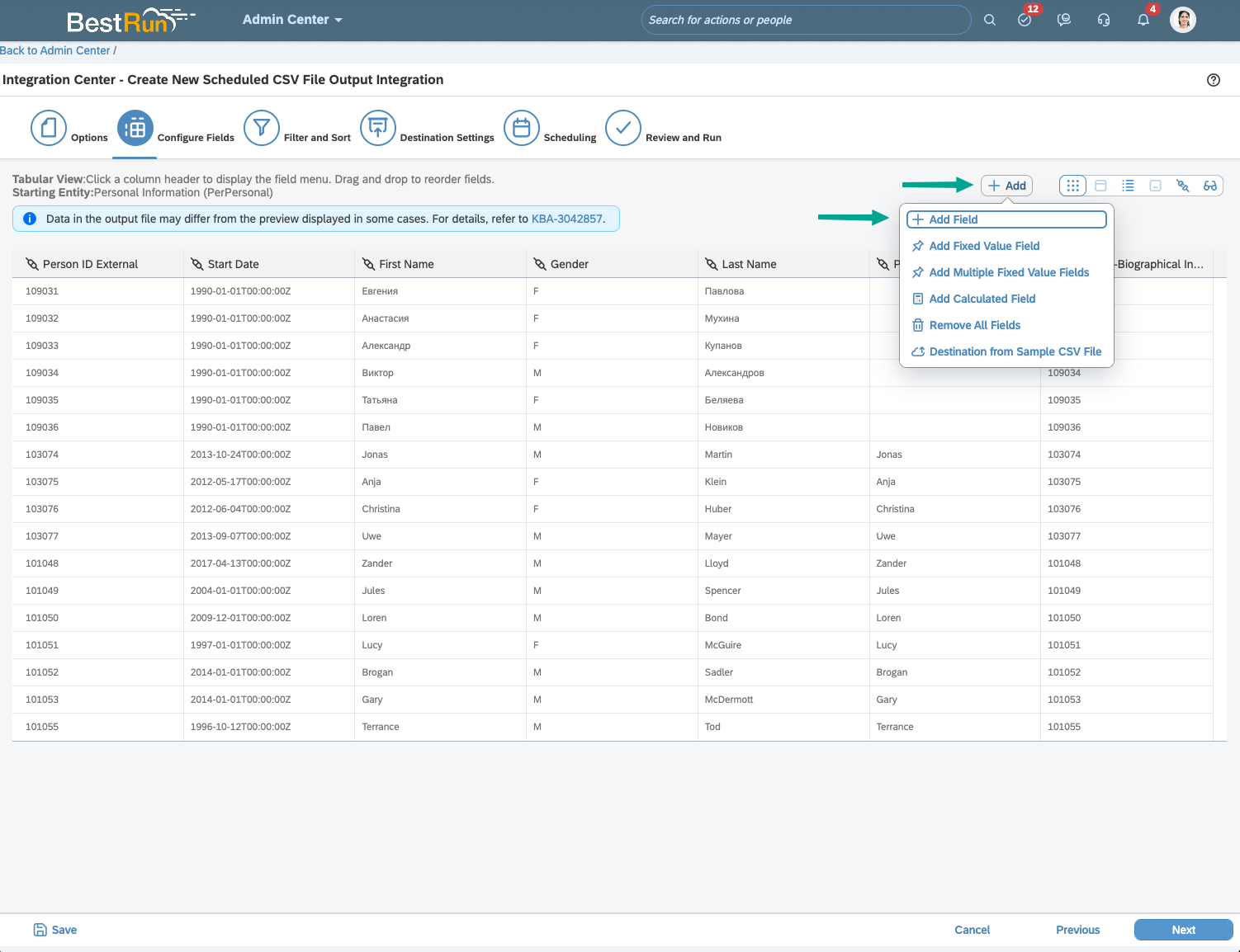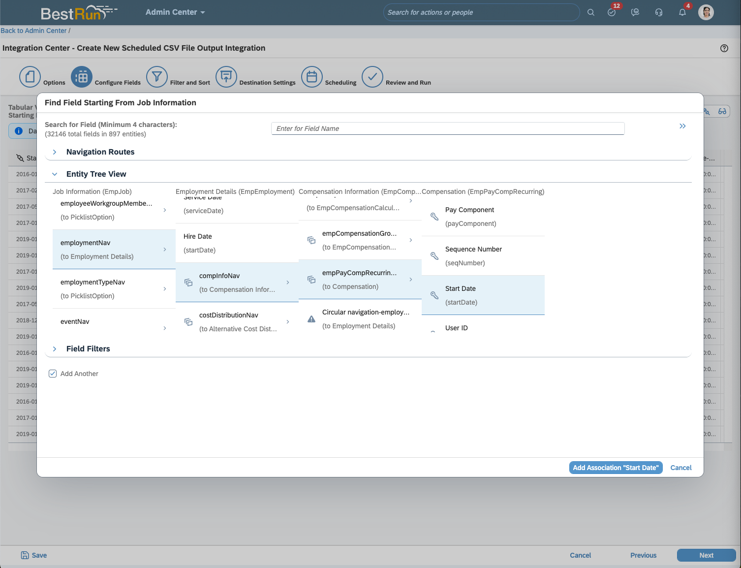 To include additional fields from EmpJob's relational tables. Click the "+ Add" button and select "+ Add Field". If you don't have any additional fields to include, skip ahead to Step 3.