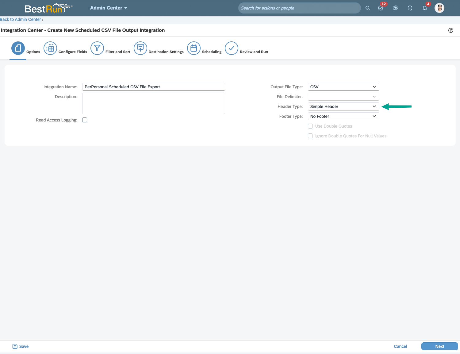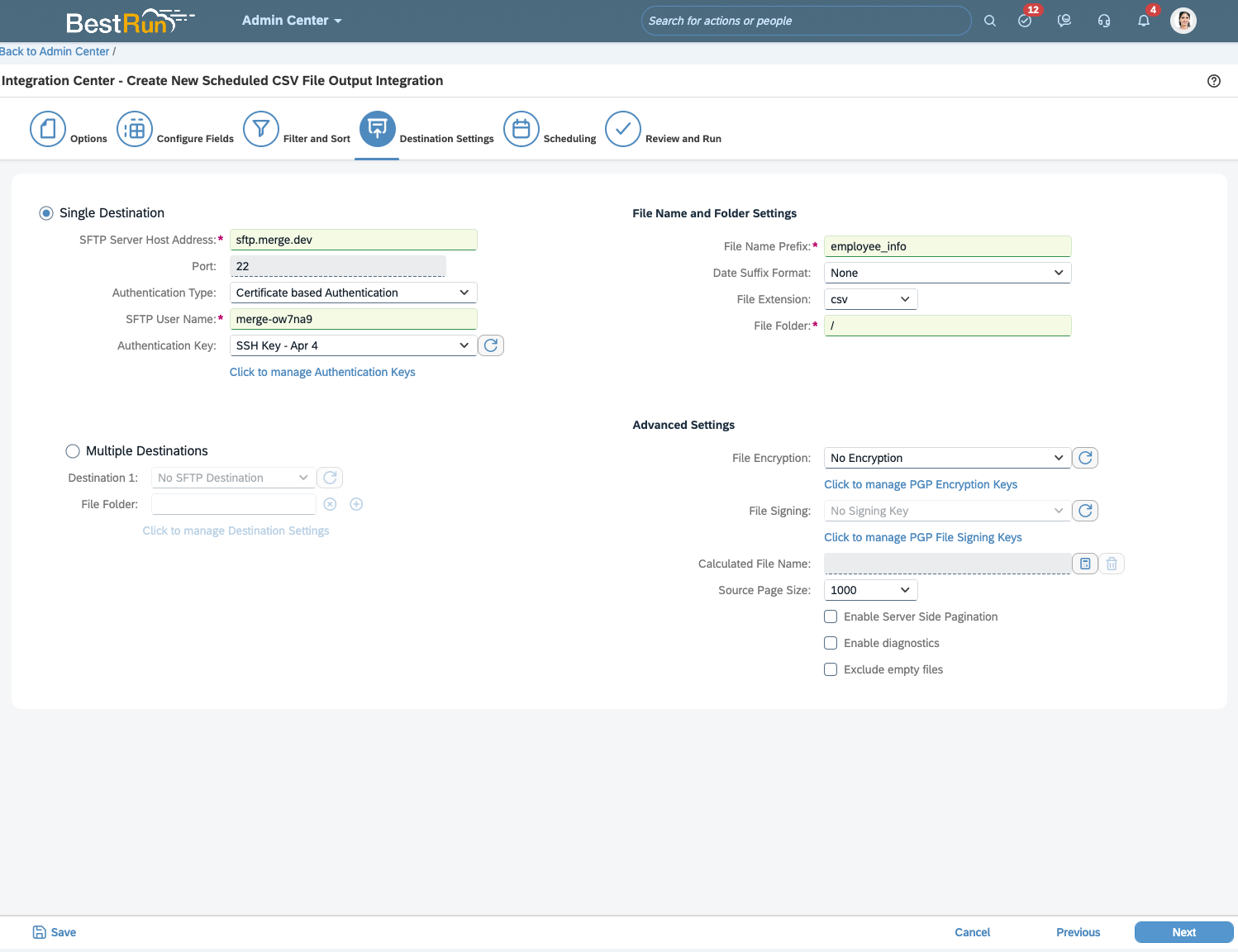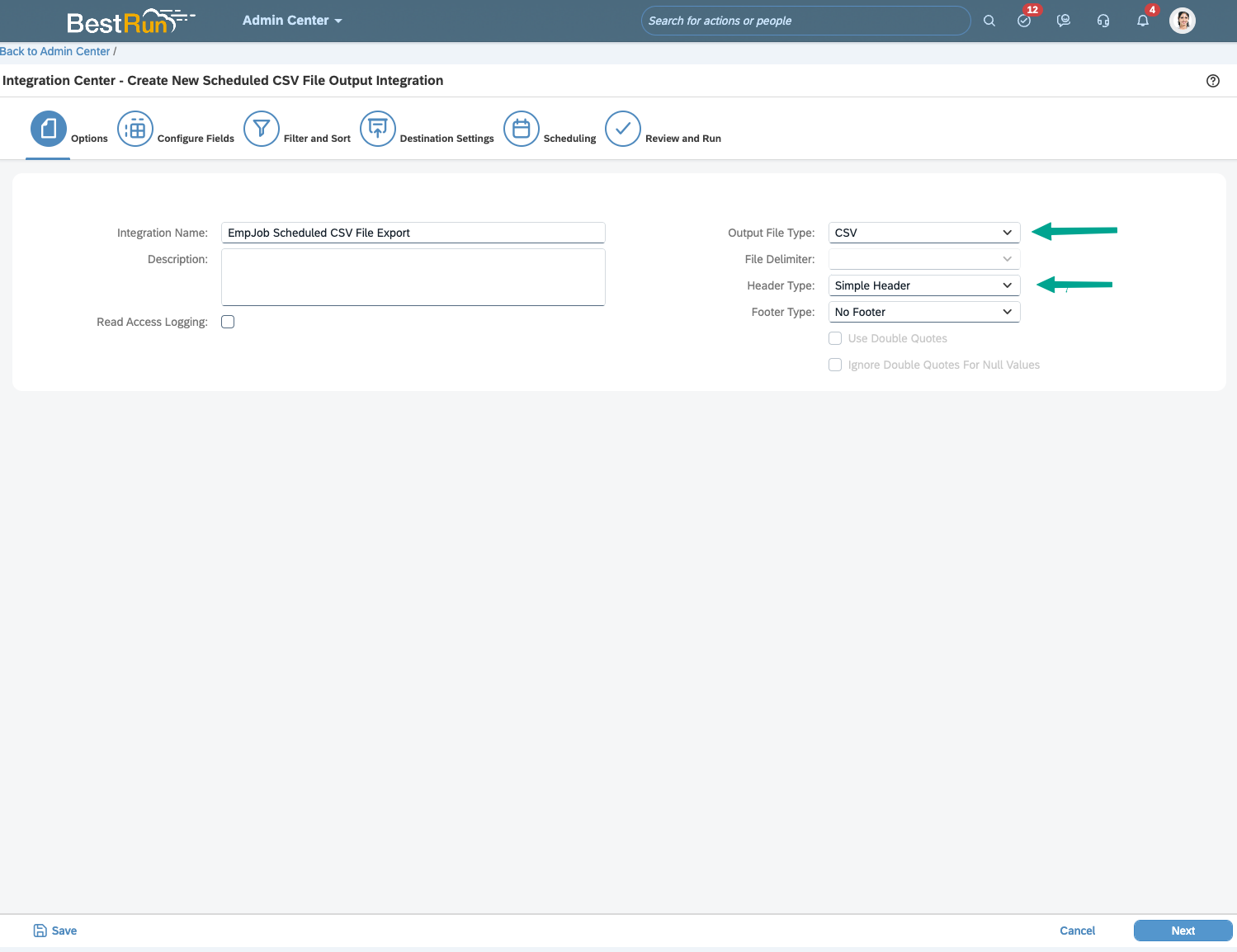 Once you have added all of the fields you need for this Employee Report, press "Next" until you reach Destination Settings. Then follow the instruction in Step 3.