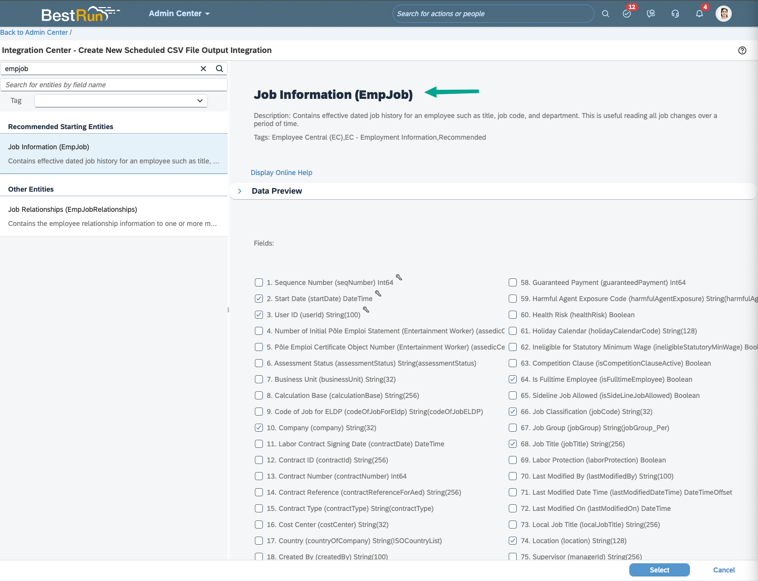 Assuming you've already followed the setup in Step 2. To generate an Employment History Information report, type "EmpJob" in the Entity Name search field then select Job Information (EmpJob).