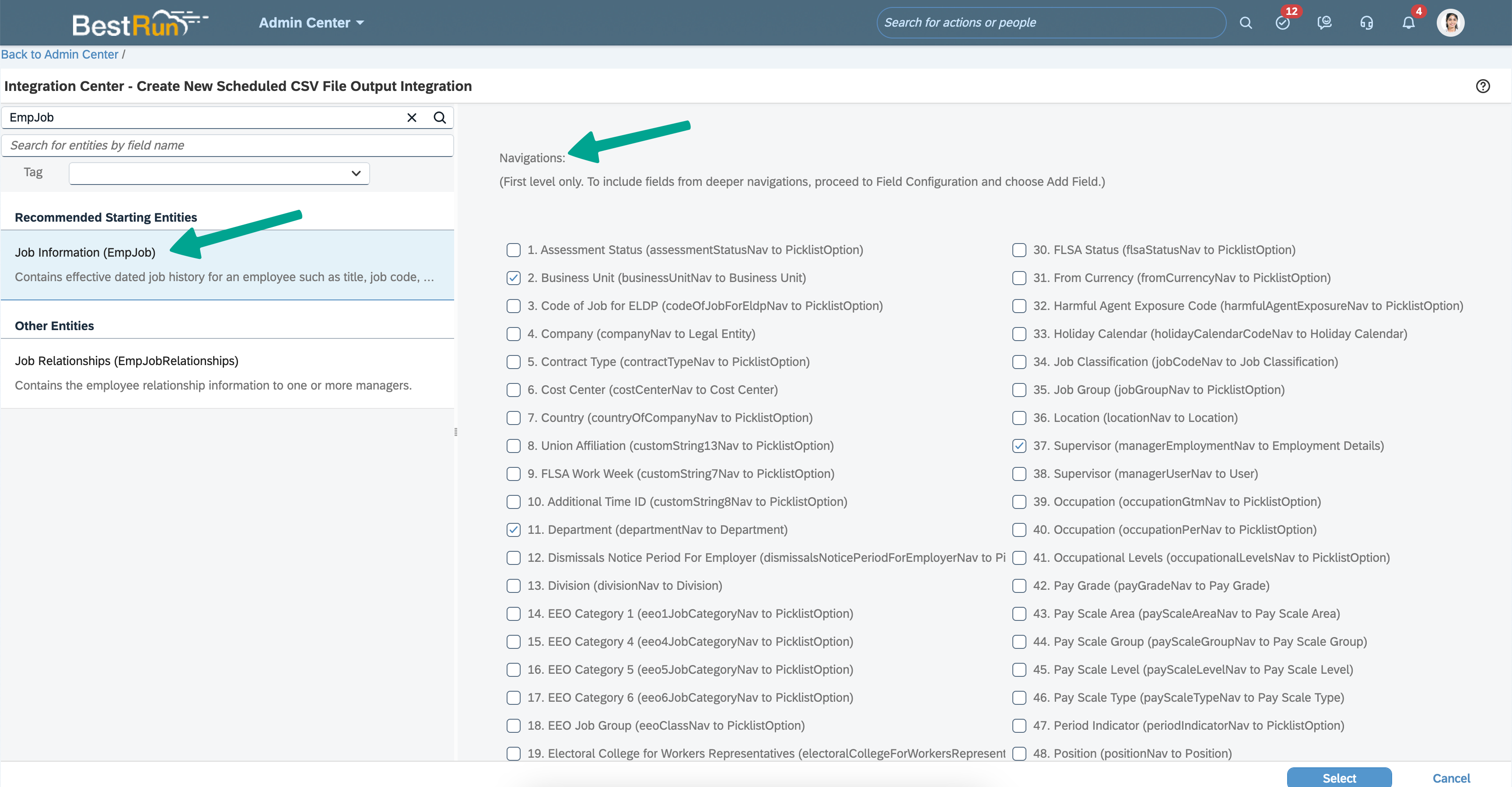 Select the checkboxes in the "Navigations" portion of the window for any fields relevant to your use case.