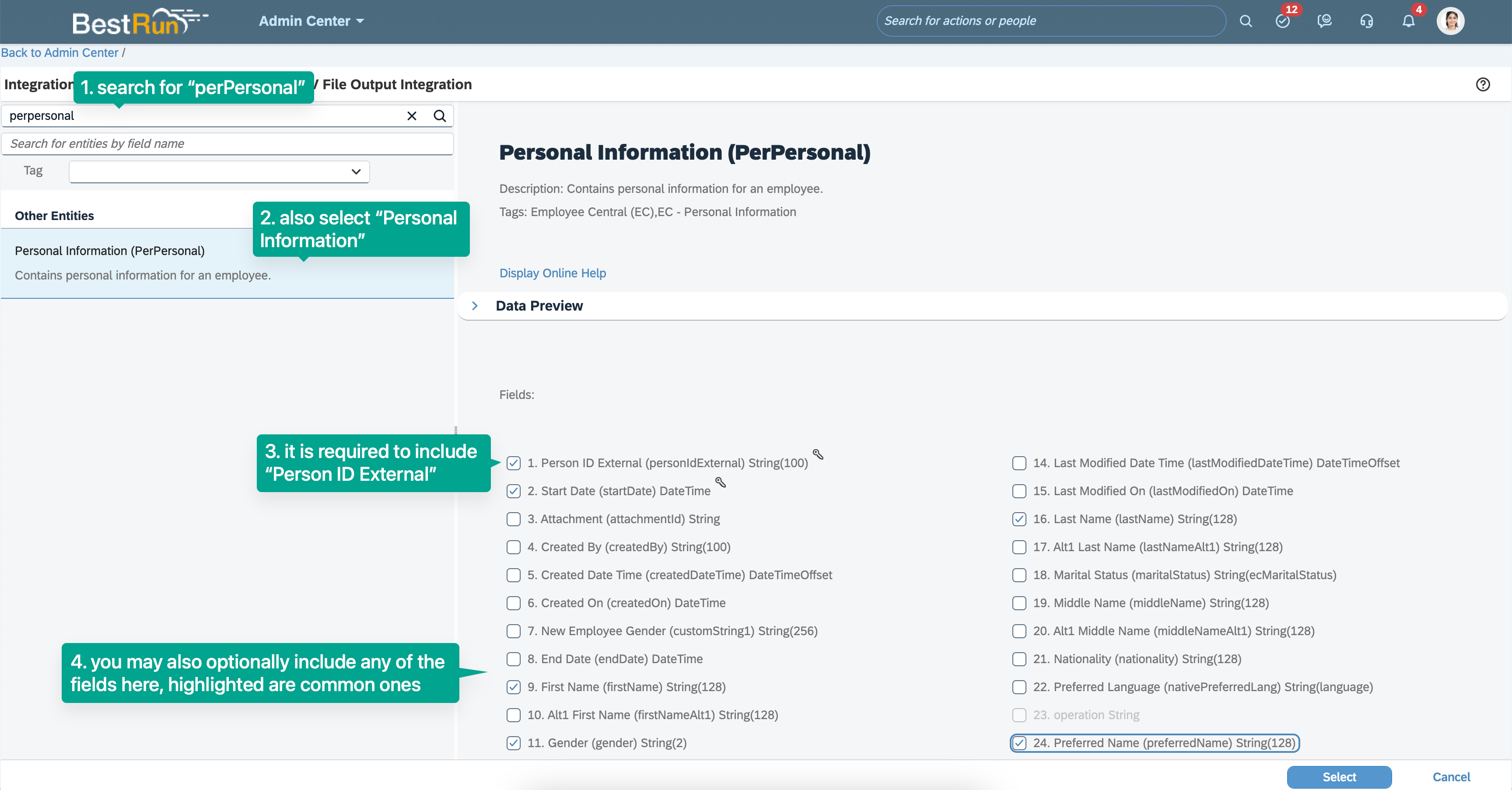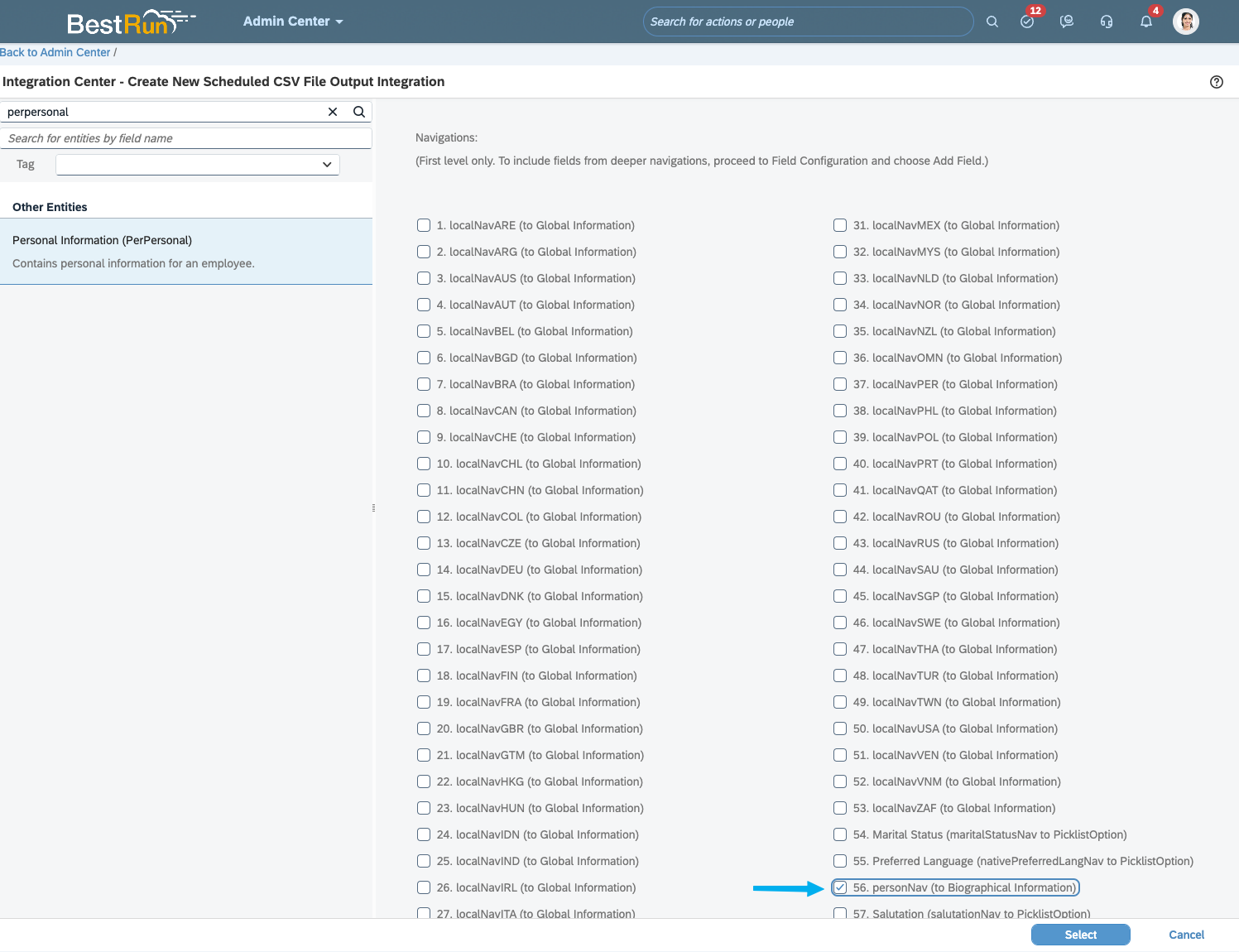 Optional: If you want to include employee number or employee date of birth, you'll need to access PerPersonal's relational table by checking "personNav" (item 56), see screenshot below.
