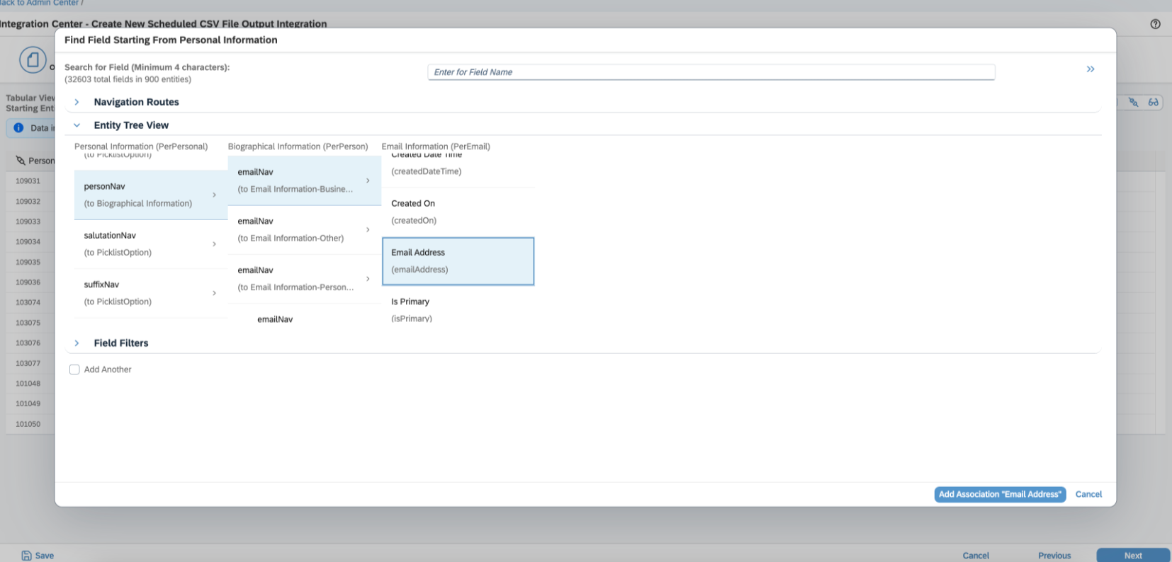 In the “Entity Tree View”, select personNav and select emailNav (to Email Information-Business)