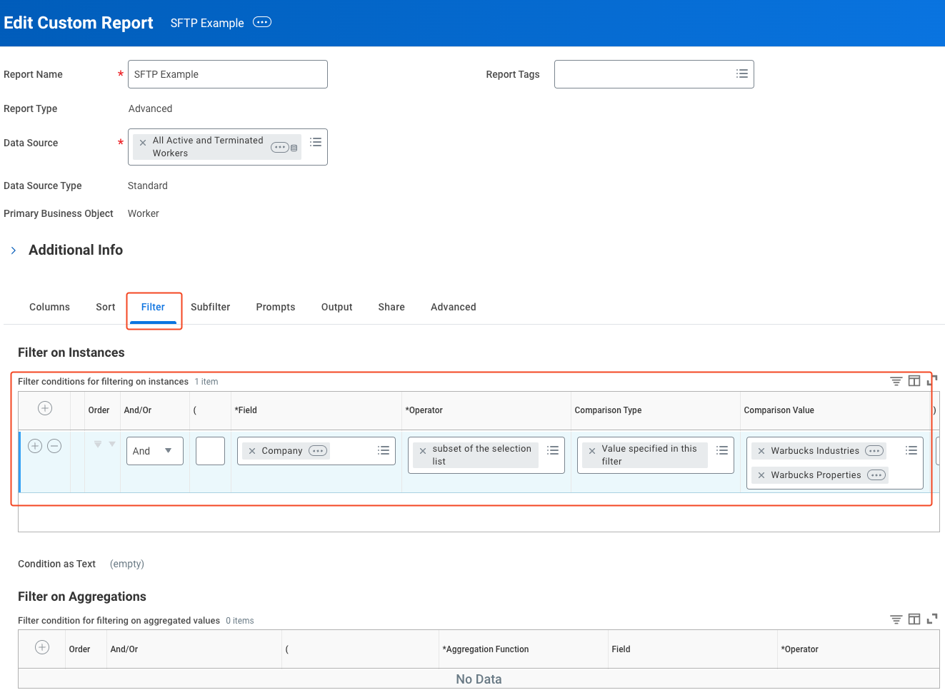 The report configuration as outlined above will send all employees via the generated file. Should you want to only send a subset of the employees, you can set up a Filter in the Customer Report. This would be configured between steps 2 and 3. An example filter has been included below: